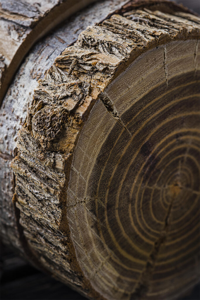 Los paneles Sections se fabrican mediante un proceso de corte transversal de todo el tronco. Este proceso produce hojas de chapa circulares de diferentes tamaños, determinados por el diámetro del tronco utilizado. El resultado es un material con un diseño distintivo que realza la belleza y singularidad de la madera en cada una de sus secciones.